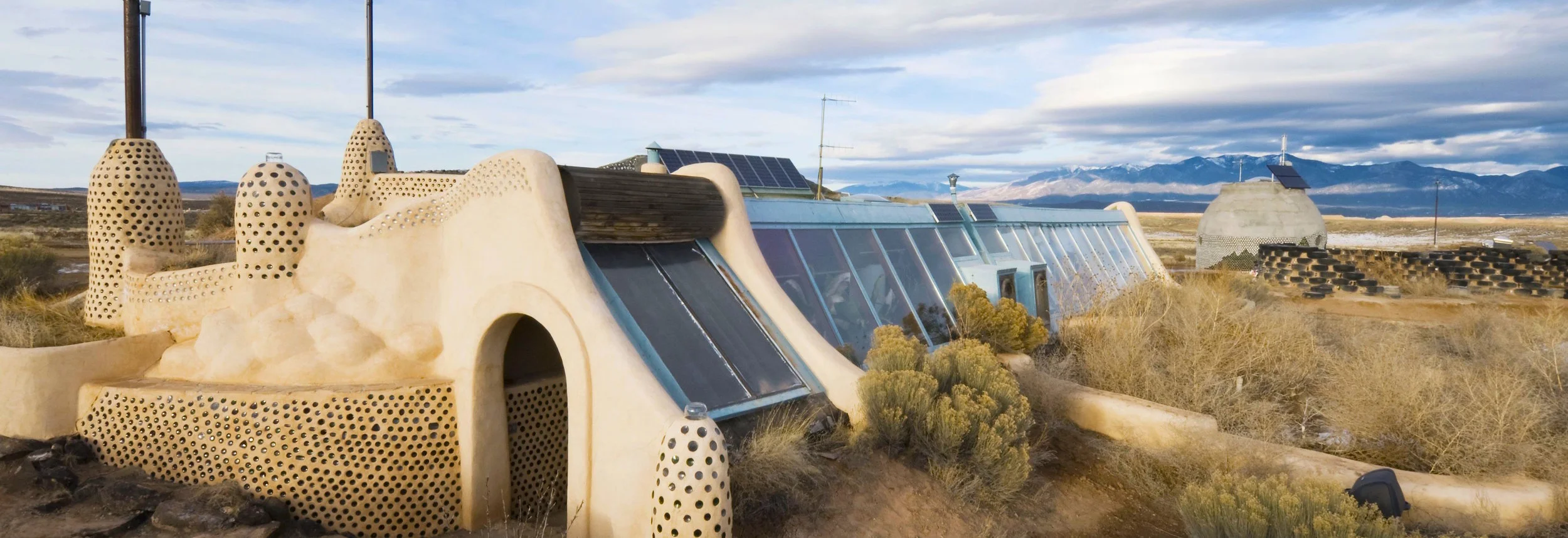 The most well known modern concept is the Geodesic Dome promoted by Buckminster Fuller. If you look around Taos, especially out on the mesa, you will see quite a few geodesic dome homes as well as sustainable greenhouses. Geodesic domes are the only man-made structure that is proportionally stronger the more it increases in size. It is made with wood or steel struts, into triangles that form into a series of great circles. Construction costs, especially if building from scratch can be higher due to the many hours needed to construct the individual triangles, however kits are also easily obtainable.